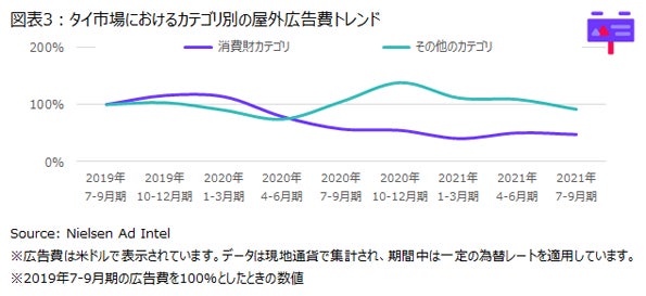 そして、競合他社の出稿量と比較しながら、自社の広告費を増やすべきかどうか判断する必要があります。例えば、広告費を増やす場合でも、単純に全体的に増やすのではなく、競合他社の出稿量が少ない媒体で自社の広告費を増やすなど、競合他社との差別化策を取り入れたコミュニケーションを取る方法を検討することも考えられます。実際、タイ市場の屋外広告費のトレンドを見ると、消費財カテゴリではコロナ前の半数程度の出稿ボリュームが続いていますが、耐久財などのその他のカテゴリではコロナ前の水準近くまで広告費が回復してきています、(図表3)。例えば、タイに進出している日系の飲料・食品ブランド企業は、競合が今回のように屋外広告比を増やしていないことを確認した上で、屋外広告への出稿を増やすことを検討すると良いでしょう。ブランドの担当者としては、カテゴリ全体のトレンドだけでなく、その他の業界のトレンドも合わせて把握した上で、最適なタイミングで各メディアの出稿量を変更していくことが、消費者の認知獲得において重要になります。