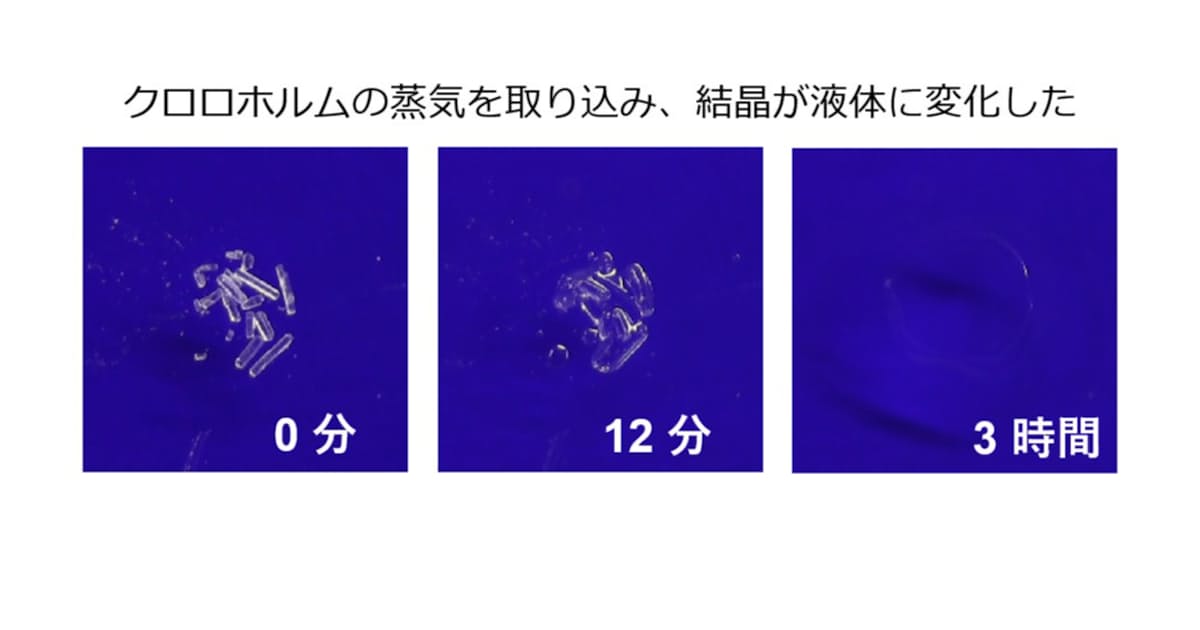 研究チームはクロロホルムの蒸気を満たして密閉した容器に、様々な種類の結晶をとじ込めて実験した。クロロホルムに溶けやすい性質を持つ結晶を入れたところ、数倍の重さの液体に変化した。有機溶媒でも潮解に似た現象が起きたと考えられるという。トルエンや紡糸などに使われるジメチルホルムアミドでも同様の現象が確認できた。