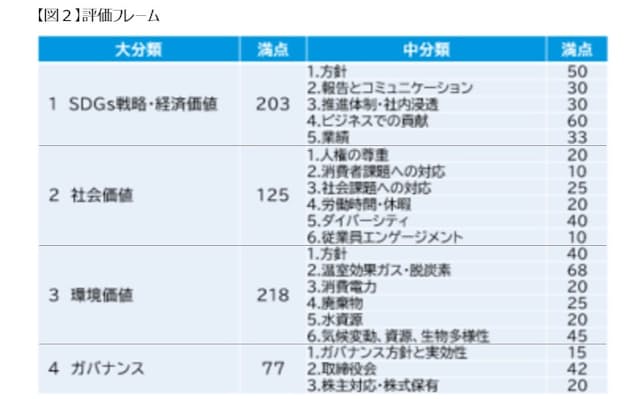 本調査は、SDGs経営の実態を把握すると同時に、その取り組みの状況から、SDGs経営の進捗度合いを定量的に評価することを目的とする。SDGs経営の評価フレームとしては、「SDGs戦略・経済価値」「社会価値」「環境価値」「ガバナンス」という4つの大分類を設けた(図2)。各大分類は3~6の中分類で定義・構成している。