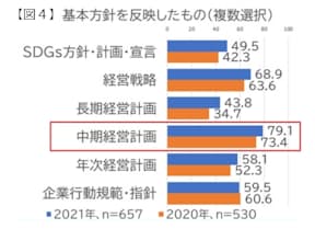 この結果を図4にまとめた。21年調査の回答割合をみると、最も多かったのは「中期経営計画」で79.1%と8割近くの企業が挙げた。「中期経営計画」は20年調査でも、基本方針の反映先として73.4%で最多だった。21年はそこから5ポイント以上、回答割合が高まった格好だ。